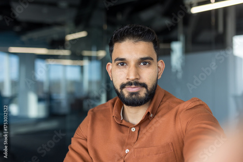 Young indian man in brown shirt confidently taking a selfie in a modern office, creating professional social media content and showcasing entrepreneur style and smart-casual confidence