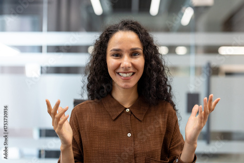 Young woman smiling at camera, having engaging conversation during online video conference, expressing happiness and optimism in modern corporate environment