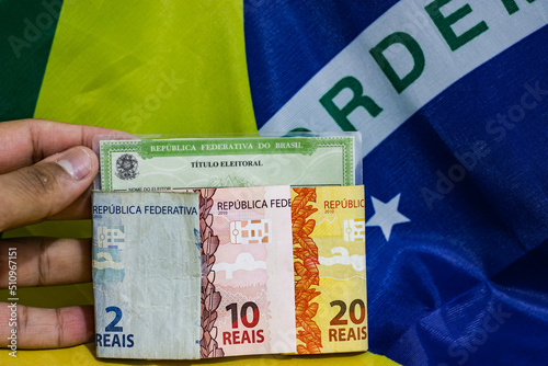 "Compra de votos" in Brazil. Document written in Portuguese: "Federative Republic of Brazil - Electoral Title" wrapped in Brazilian currency notes.