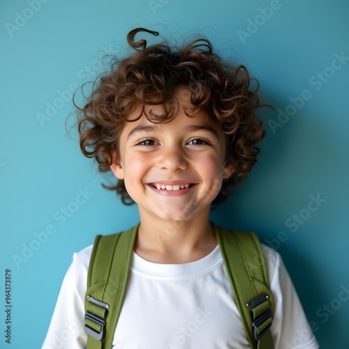 "Retrato de un niño sonriente con cabello rizado y una mochila verde. El niño viste una camiseta blanca y está de pie frente a un fondo azul suave, lo que realza su expresión alegre y llena de energí.