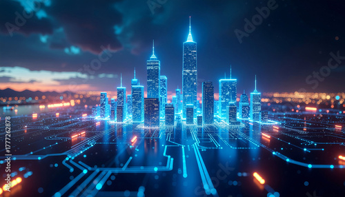 Futuristic cityscape with glowing network connections at night, ideal for tech innovation, smart city solutions, and cutting-edge technology concepts