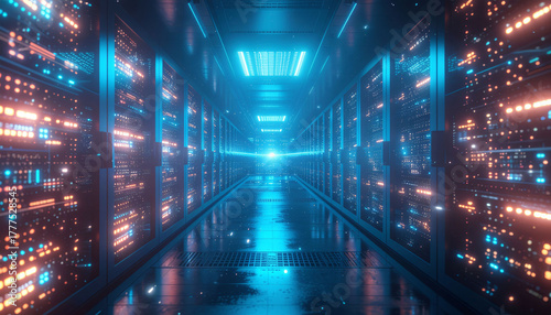 Immersive futuristic data center hallway glowing with vibrant blue and orange lights, representing innovation and advanced technology.