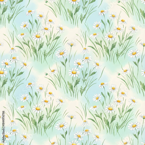 Seamless watercolor daisy meadow pattern with green grass and soft pastel tones