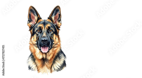 "German shepherd dog portrait with the word "intelligent" on a white background.
