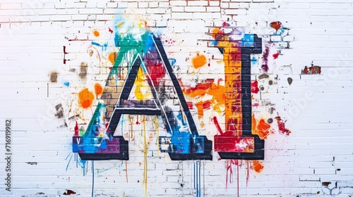 "AI" logo depicted with a graffiti spray paint style, urban and edgy, sprayed boldly onto a white brick wall