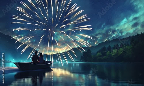 A serene night scene depicts two figures in a boat, gazing at a vibrant fireworks display against a starry sky.