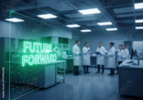"FUTURE FORWARD" holographic display in a modern lab with scientists, symbolizing innovation, technology, and collaborative progress.
