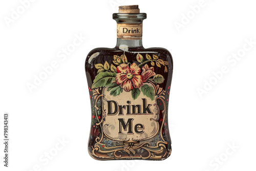"Drink Me" potion bottle with vintage botanical flower illustration isolated on transparent background. Classic elegance concept. Design for poster, banner, invitation.