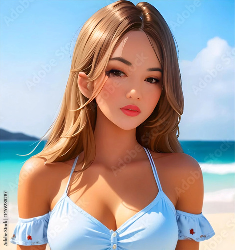 A virtual image of a young woman emerging from the sea after a long swim. AI-Generated