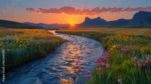 "Wide-angle photograph of a vibrant sunset over a flower-filled meadow and winding river with mountain silhouettes in the background" Generative Al
