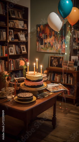 "Literary Birthday Bliss: Cake, Candles, and Balloons Amongst Books" AI-Generative