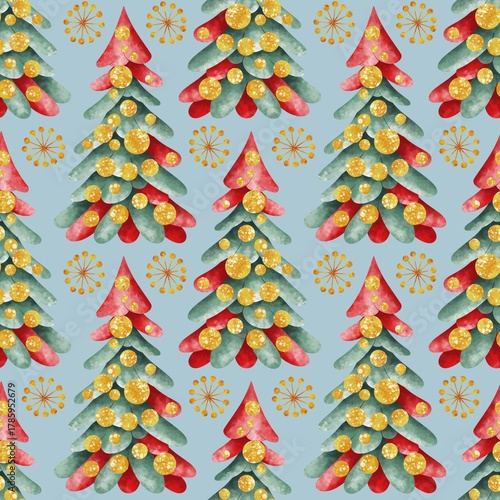 "Cozy Winter Forest - Cute Christmas Animal Collection." A festive seamless pattern featuring a colorful Christmas tree surrounded by snowflakes on a blue background.