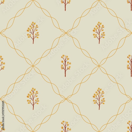 "Cozy Winter Forest - Cute Christmas Animal Collection," a festive seamless pattern with golden trees on a beige background.