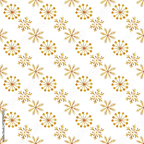 "Cozy Winter Forest - Cute Christmas Animal Collection." Festive seamless pattern with golden snowflakes on a white background.
