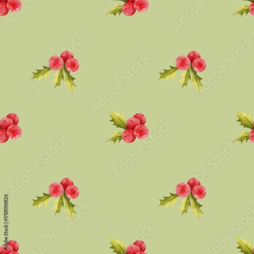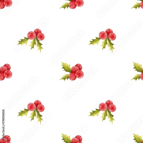 "Cozy Winter Forest - A Cute Christmas Animal Collection." A sweet seamless pattern featuring red berries and green leaves on a white background.