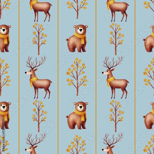"Cozy Winter Forest - A Sweet Christmas Animal Collection." A cute seamless pattern featuring a brown deer and a bear with yellow scarves, surrounded by golden trees on a blue background.