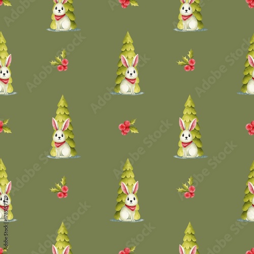 "Cozy Winter Forest - A Cute Christmas Animal Collection." A sweet seamless pattern featuring a white bunny with a red scarf and a green tree on a green background.