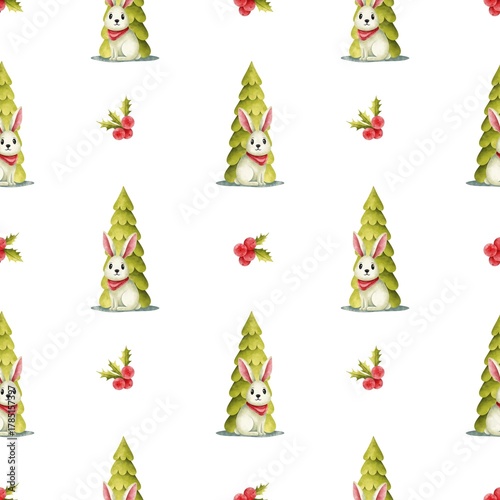 "Cozy Winter Forest - A Cute Christmas Animal Collection." A sweet seamless pattern featuring a white bunny with a red scarf and a green tree on a white background.