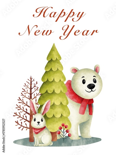 "Cozy Winter Forest - Cute Christmas Animal Collection." A sweet watercolor Christmas card featuring a polar bear and rabbit in a winter forest on a white background.