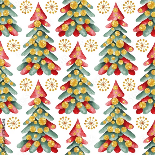 "Cozy Winter Forest - Cute Christmas Animal Collection." A festive seamless pattern featuring a colorful Christmas tree surrounded by snowflakes on a white background.