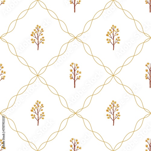 "Cozy Winter Forest - Cute Christmas Animal Collection," a festive seamless pattern with golden trees on a white background.