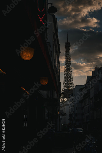 "Dramatic Skyline Over Paris with Eiffel Tower" - Focuses on the moody sky over Paris, with the Eiffel Tower piercing through the clouds.