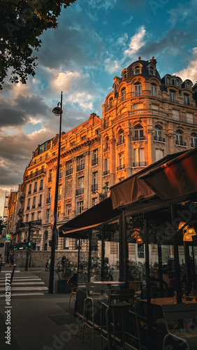 "Charming Parisian Street Café at Golden Hour" - Showcases a quaint street café in Paris bathed in the golden hour light, inviting and warm.