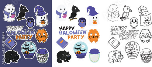 happy Halloween Party stickers. with witch,punpkin,castle,thebooparty,pumpkin,half moon, ghost,