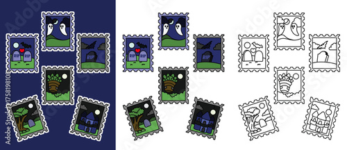 "Spooky Halloween Stamp Collection with Ghosts, Tombstones, and Haunted Houses"