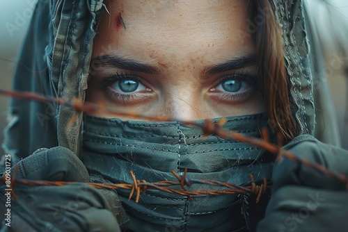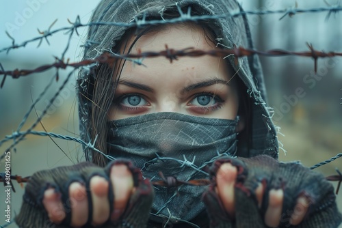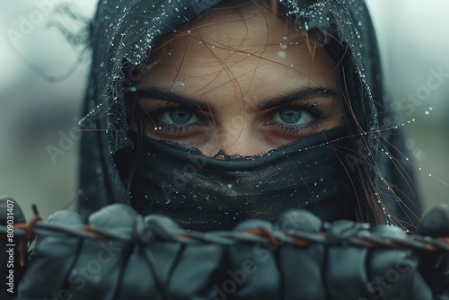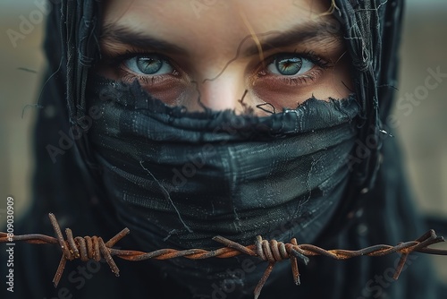 "Resisting Oppression: Masked Woman Gripping Barbwire, Defiance Against Tyranny"