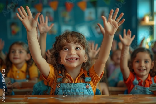 "Elementary STEM Class for Talented Children: Young Female Instructor Engages Students in Learning. Enthusiastic Boys and Girls Raise Hands to Participate and Share Answers to Teacher's Questions."