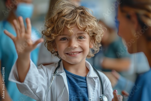 "Young Boy Shares High Five with Pediatrician: Friendly Doctor Welcomes Preschool Patient for Positive Checkup, Mother and Son Visit General Practitioner at Hospital"