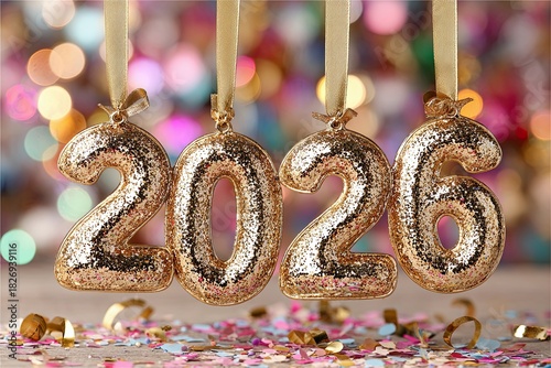 "2026" Hanging gold 3D numbers with gold ribbons and confetti on a colorful background with bokeh effect.