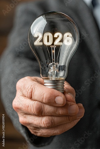 "2026" is the year. A man holds a light bulb with a bulb that changes from 2026 onward to start the year with new ideas.