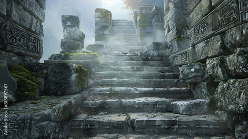 "Mystic stone staircase leading to a Druid temple, shrouded in mist and carved with runes."