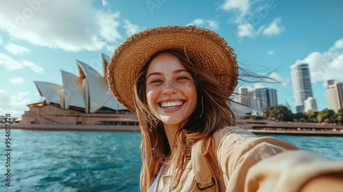 Happy Woman in Straw Hat Smiling with Sydney Opera House in Background - smile