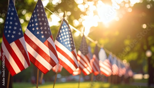 American Flags Line Up Bathed in Golden Sunset Light, Patriotic Cel...