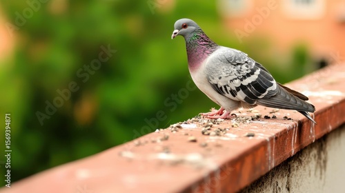 Pigeon Standing on Balcony Railing Surrounded by Droppings in Urban Landscape with Blurred Background