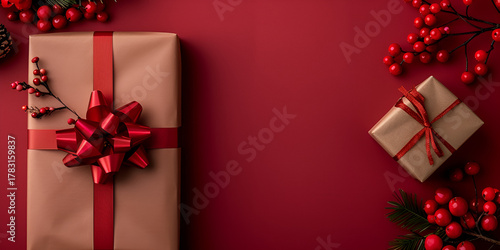 "Gift Wrapping with Red Ribbons, Bows, and Holly Berries for Christmas Stock Photos"