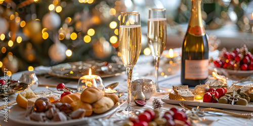 "Elegant Christmas Dinner Table with Champagne, Delicacies, and Christmas Tree for Stock Photography"