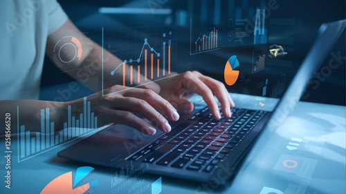Multiple computer monitors displaying financial charts and graphs in a dimly lit office setting data