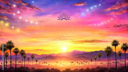 "Watercolor Sunset Background in Pink, Purple & Gold – Breathtaking Coachella-Inspired Festival Sky with Copy Space"
