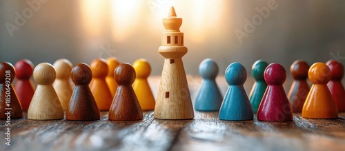 Colorful wooden pawns gathered around a taller central wooden tower on a rustic tabletop, conveying leadership, unity, teamwork and inclusive collaboration in warm sunlight