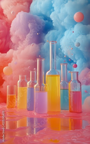 "Still from Video Featuring Colorful Chemical Structures, Beakers, and Abstract Lines in Soft Pastel Background"