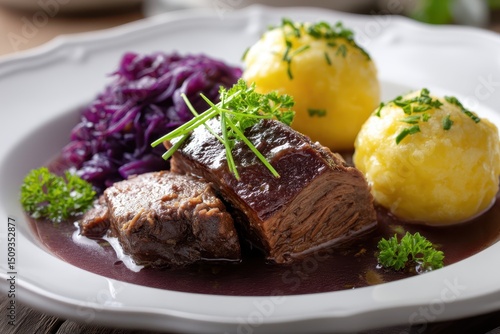 Rinderbraten mit Rotkohl und Knödel Schmorbraten deutsches Essen Hausmannskost Festessen Sonntagsbraten deftige Mahlzeit Winteressen Fleischgericht Traditionell Soße Kartoffelklöße Essen anrichten