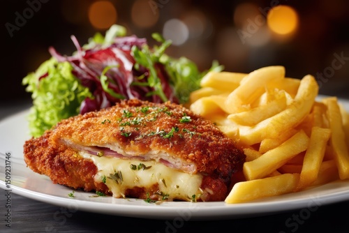 Cordon Bleu Teller Pommes Frites Salat Beilage Panierte Schnitzel Käse Schinken Füllung Hausmannskost Mittagessen Klassisch Knusprig Gebraten Restaurant Gericht Rustikal Nahaufnahme