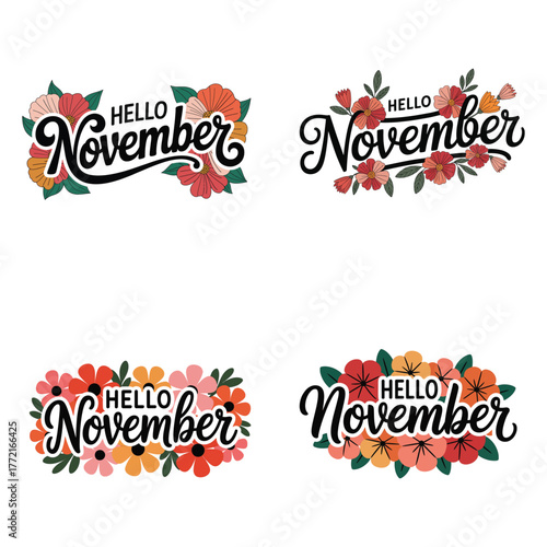 "Hello November Floral Lettering Vector – Autumn Season Hand Lettering with Colorful Flowers for Greeting Cards, Posters, and Seasonal Design"