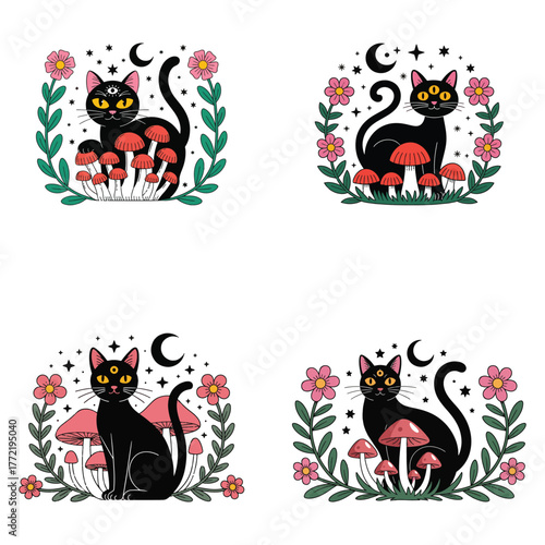 "Mystical Black Cat with Mushrooms and Moon – Cute Witchy Cat Vector Illustration with Floral and Night Elements for Halloween and Magical Design"