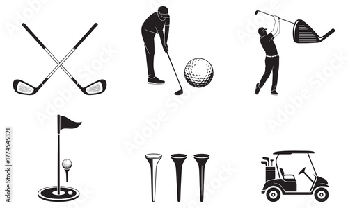 "Golf Equipment Icons Set: Clubs, Ball, Tees, Flag, and Cart - Vector Illustration"