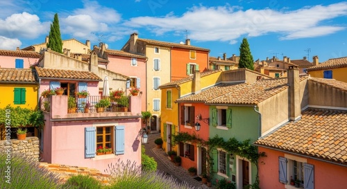 Charming provencal village streetscape featuring vividly painted houses under a bright blue sky